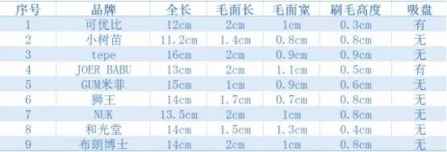 从以上表格来看,9款牙刷中全长、毛面长都符合国家标准要求;毛面宽的**,可优**刷毛高度低于国家标准,和光堂的牙刷超标准0.2厘米。另外,其实给小一点的宝宝买牙刷,最重要的就是选择一款小刷头的牙刷,这几款中,综合比较,可优比、JOER BABU、米菲GUM、和光堂和**博士的刷头较小。