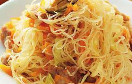 2)米粉、虾米用热水泡软,备用。c热油锅,油爆香葱、洋 葱、虾米,加入鸡腿条、香菇、卷心菜、胡萝卜、南瓜拌炒至8分熟,加入盐、酱油、胡椒粉调味,最后加入米粉拌炒至熟,即完成。