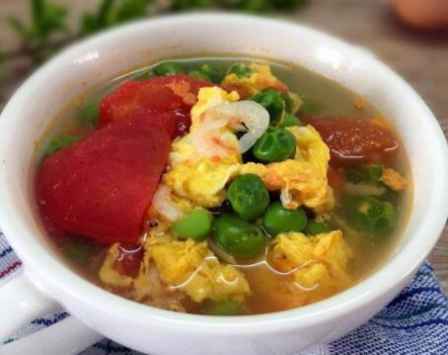 材料:豌豆250g、鸡蛋2个、鸡汤700ml、葱末适量、姜末适量、面粉1勺、盐适量、黑胡椒适量、葡萄籽油适量、圣女果适量、小绿叶适量。