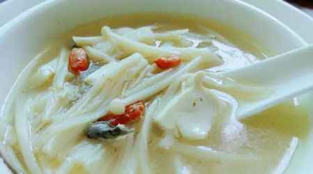 做法: 金针菇洗净备用; 豆腐切小块备用; 先将鲫鱼宰好,去内脏,洗净并以干布吸去水分备用; 开锅下油,爆香拍蒜和姜片,放入鲫鱼将两面煎至金黄,攒少许米酒,加入适量鸡汤和金针菇、豆腐,中火煮15分钟,调味后撒入葱花即成。