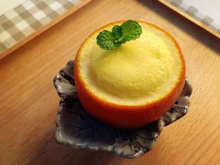 1.将甜橙三分之二处切开,取出果肉。