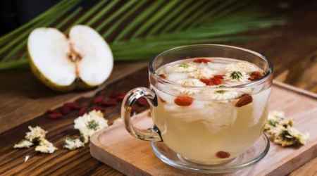 梨润肺清热,生津止渴,与冰糖同用,增强润沛止咳作用,可治疗肺燥咳嗽、干咳无痰、唇干咽干等症,特别适合秋天食用。将雪梨去皮,切开顶部,用勺子挖掉内核,中间放入冰糖,放回顶盖,将雪梨将雪梨雪梨放入蒸锅内蒸30分钟左右,就能吃了。要坚持食用几次才可见效。