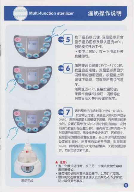 注意:所有的配件都应用洗涤剂洗净,在装入消毒锅前,最好使用用奶瓶刷清洗过,然后用清水冲净。另外,严禁使用微波炉上“烧烤档”,使用时一定要加入200ml的水,不可直接放入微波炉消毒,无论在何种情况,不得在无水状态下操作。#p#副标题#e#