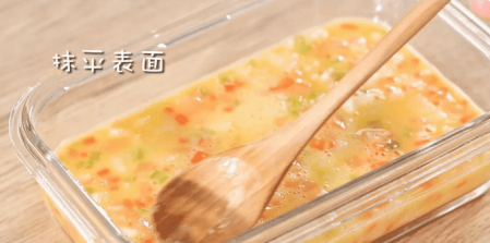 准备一个玻璃盒,在底部垫上硅油纸或者刷上一层薄薄的食用油,倒入米饭糊并抹平表面。
