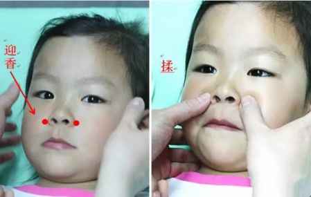 动作:按住鼻翼两侧的迎香穴,用大拇指螺纹面按揉,6周岁以下的幼儿按揉2-3分钟,大孩子按揉3-5分钟,到皮肤略微发红、透热为止。也可将浸过冷水的毛巾拧干后,擦迎香穴直到发热。