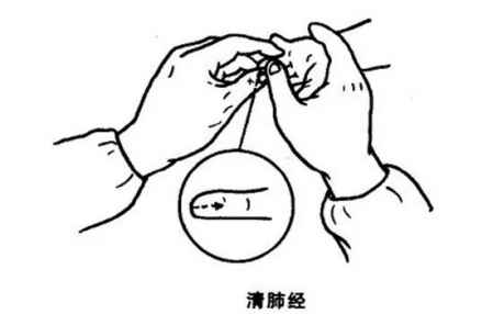 3、操作:旋推为补,称“补肺经”;由指端向指根方向直推为清,称“清肺经”,补肺经和清肺经统称“推肺经”。此处选用清肺经,推100~300次。