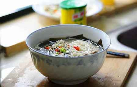 材料:排骨150克、发好海带100克、杂面条100克、姜、食盐适量。