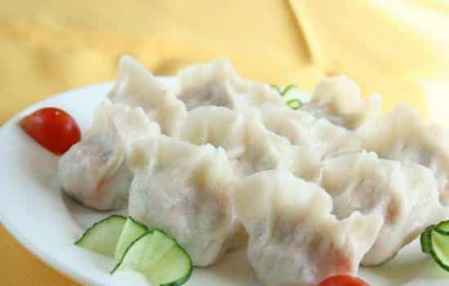 3.将水倒入锅内,开后下入水饺,边下边用勺在锅内慢慢推转,待水饺浮起后,见馅与皮鼓起,捞出即成。