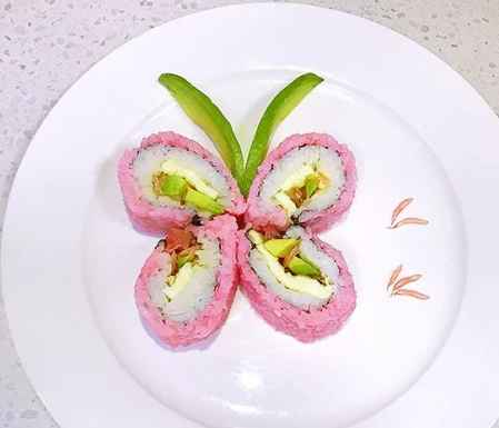 5、取下保鲜膜,刀沾水将寿司切块。取两片牛油果,和切好的寿司摆成蝴蝶形状。