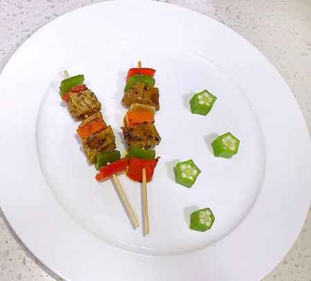 5、取竹签将煮好的蔬菜和羊肉串成串,然后把竹签尖端剪平,防止孩子刺伤。在肉串上均匀涂抹酱汁即可。喜欢孜然、咖喱或番茄口味的,可将黑胡椒末换掉。