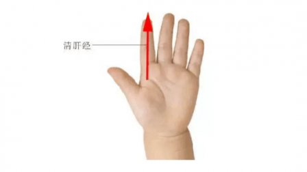 手法:左手握住宝宝的手,使其手指向上,手掌向外;右手拇指从宝宝食指的末节指纹开始,推向指尖,称为清肝经。