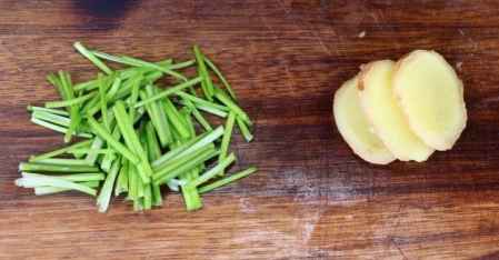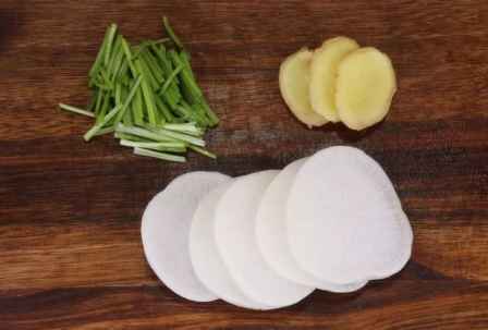 步骤 2:白萝卜洗干净、切成薄片,姜洗净切成片(姜片去不去皮都可以,如果宝妈不放心,可以去皮后再切成小皮)。
