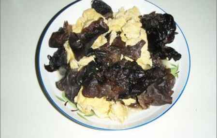 4、然后放木耳翻炒,看木耳有油亮亮的光泽以后,放入刚才摊好的鸡蛋,继续翻炒几下。
