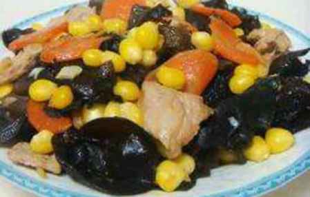 材料:玉米粒,**耳,猪肉,胡萝卜,花生油,姜末,蒜末,胡椒粉,酱油,盐,葱花。