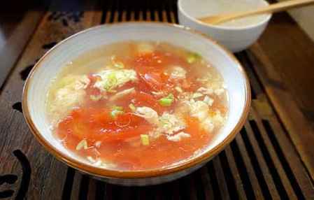 材料:西红柿2个,鸡蛋1个,青葱1根,生姜3片,猪油1/3汤匙,香油2滴,白胡椒粉少许,盐1/2茶匙,味精少许,清水700毫升。
