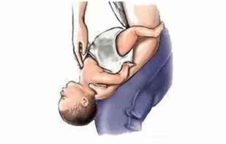 1、对于较小的孩子(3岁以内),救护人应马上把孩子倒立抱起来,一只手臂贴着孩子的前胸,用手捏住孩子颧骨,让其脸朝下的趴在救护人膝盖上。另一只手拍打其背上拍5-6次,并观察异物是否吐出。