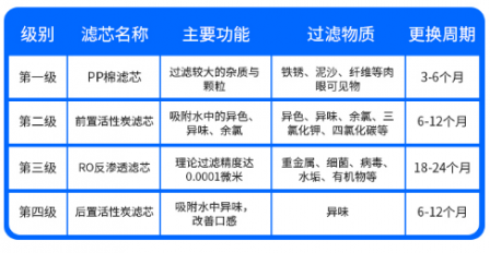 小米净水器滤芯寿命是根据旅行过水量、使用时间、水流量、自来水和纯净水水质等多种因素整合算法计算,滤芯不用,净化能力与寿命也都不相同,具体如下图所示: