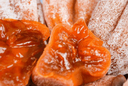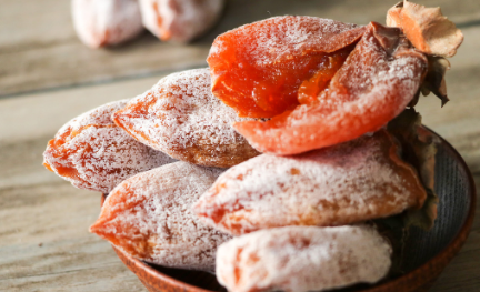 柿子晒干后,表面的白色物质就是柿霜,主要成分是果糖。由于柿子是干果,自然晒干,水分蒸发,溶解在水中的果糖在此过程中析出,形成柿霜。