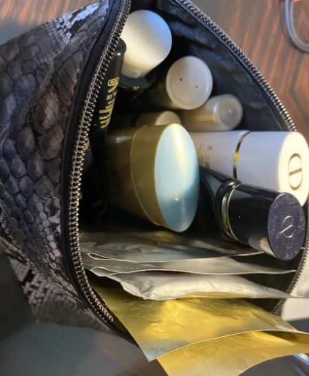 3、整理好之后的样子,洁面和长隔离竖着放个化妆包拉链是拉不上的。我就这样敞口放置装进双肩包了