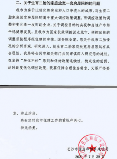 在长沙市住建局的回复文件《关于长沙市十五届**七次会议第073号建议的答复》中显示,“长沙市为房价比较 优势突出和人口净流入的城市,对生育二胎家庭放宽房屋限购属于重大调控政策调整,而调控政策的调整和变化牵一发而动全身,关乎调控目标的实现和房地产市场平稳健康发展。且长沙市为国家长效调控试点城市,调控政策的调整须按 程序报住建部审核、**备案。长沙市住建局将会同市相关部门共同审慎深入研究您(谭建钢)的建议,在坚持‘房住不炒’原则和保持政策连续性、稳定性的前提,适时适度优化调控政策,既要保障合理住房需求,又要严格要求,防止炒房。”