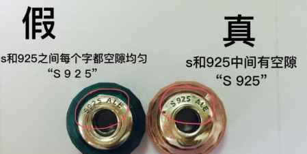 2、刻字“s925”的间隙问题:假货的s和s925之间每个字都空隙均匀,每个字之间的空隙特别均匀的就是假货;真正的正品实际上字母s和数字925之间有一点略大于其他空隙的空隙,像是一个空格。