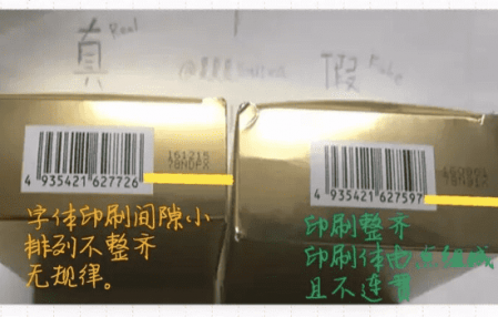 正品的字体印刷间隙小,排列不整齐并且无规律。而仿冒品印刷整齐,印刷体由点连成,且不连贯。
