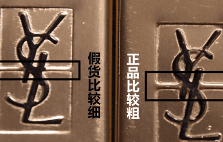 仿冒品在YSL的LOGO后面的线条较细,而正品会稍微粗一些,并且有较大的圆角效果。