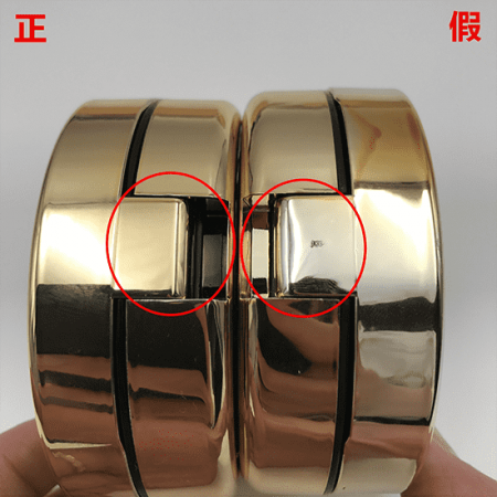 正品外部这个翻折的部位做工细致,切割十分光滑。假货中间有个凸起,大概是做工粗糙留下的。