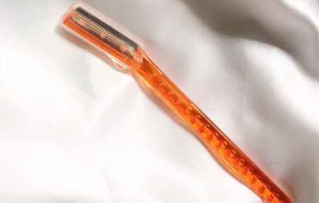 注意对比图中我加了红圈的位置,真假刀颈部不同的圈环处理,正品的修眉刀颈部位置是有一圈圆环的,而假货的修眉刀尾端却有三圈圆环。