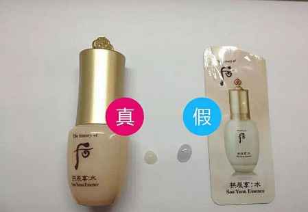 接着就是正品的比较透亮,也好推开,但是假货的却是比较黏,且很油。另外正品有淡淡的人参味,比较好闻,假货则有很浓重的人参味。10分钟后用纸擦拭,正品有渗透的痕迹,但是相反假货则只隐约看见一点反光。正品的延展性好,吸收较快,涂抹在皮肤上擦匀后就没有明显的味道,但是假货吸收性不好,涂抹在肌肤上香味停留的时间较长。