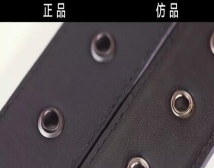 范思哲腰带在孔眼会有金属,颜色上,正品和腰带头是统一的,都是黑色;但仿品是灰色的,和黑色的腰带头颜色不一样。