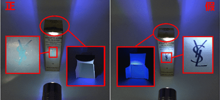 用荧光剂检测笔检测发现,假货明显含有荧光剂,正品的YSL标识不反光的,假货反光看得很清晰。