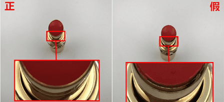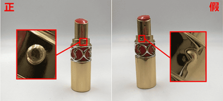 正品唇膏管卡扣处的小圆点凸起明显,假货唇膏管卡扣处小圆点弧度很大,不明显。