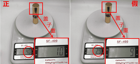 正品盖子内部一侧或中间有小数字,做工十分精致平滑,假货盖子内部没有数字,做工粗糙。