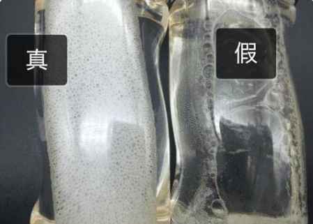 将真、假两瓶流金水摇晃同样的次数,并且在力度相同的前提下,正品的气泡较多,都是小气泡,消失速度很慢,而假货的气泡多为大气泡,并且气泡消失得很快。