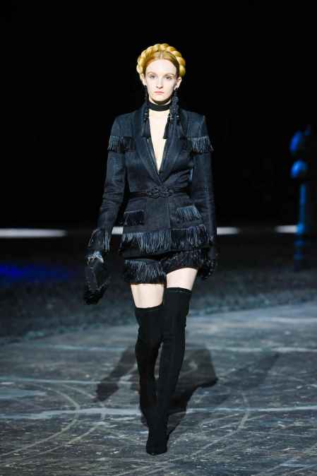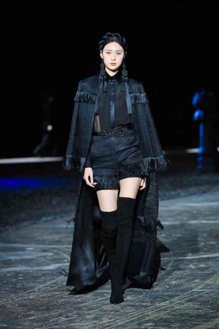 【九黎·部落】系列服饰的设计灵感来源于异域部落服饰,原生态粗纹肌理面料中织出层叠流苏,以西装版型、斗篷与经典大衣款式剪裁为主,知性与粗旷并存,展现原始自然的壮丽与神奇,呈现一种无拘无束的自由。