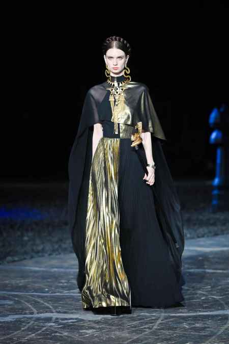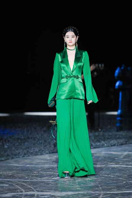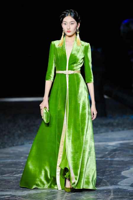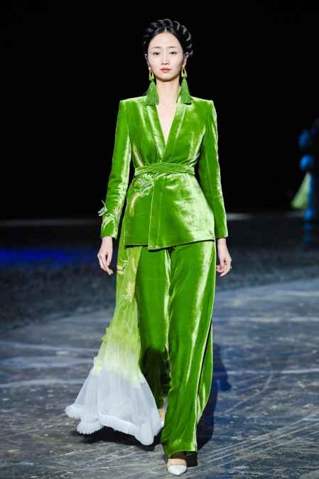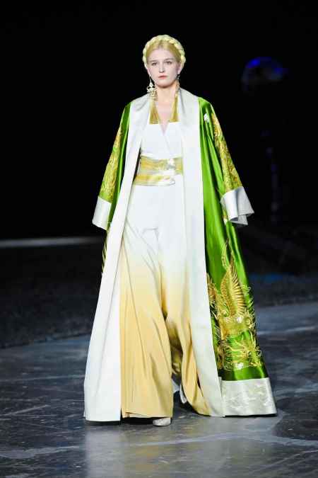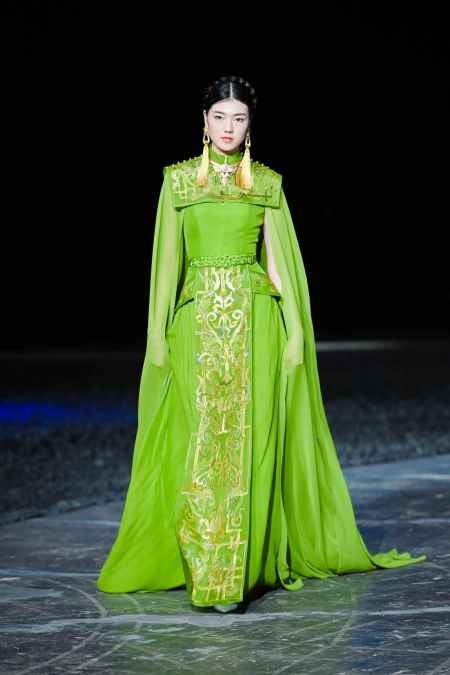 【天之四灵】本系列灵感来源于中国图腾“青龙,白虎,朱雀,玄武”。选取金和绿色为主色,结合中国饕餮纹和**纹,构成整身图腾纹样,并采用中国传统的金丝线绣和金箔绣来完成。行走间微光闪烁,刚柔并济,如战神凯旋归来。