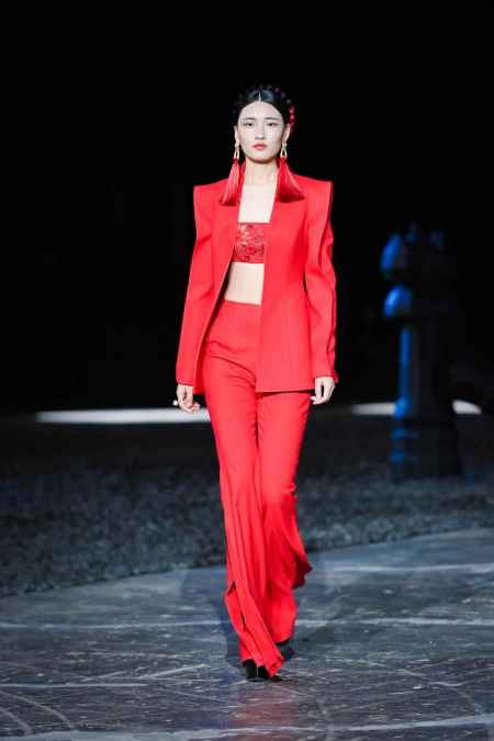 【彼岸·花魂】系列灵感来源于**初始的彼岸天国神秘花园,以不同明度的红色为主色调,展现生命的热烈与本我的自然状态。采用经典西装版型与飘逸的长裙,刻画出刚柔并济的女性形象,进口米珠、亮片等数十种材料,结合中国传统苏绣、纳纱绣、抽拉雕和欧洲珠绣,刹那间的美丽,一瞬间的永恒,热情而忧伤......