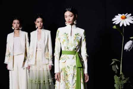 【陌上·花魂】系列选取自然米色和雅绿色作为主色调,营造舒适清新自然的观感。手工古法渐变染色,选取粗麻、天鹅绒等自然生态质感的进口面料,挺廓和飘逸的面料展现了大自然的厚重和柔美。图案选取彼岸花、昙花、绒草、帝王花、太阳菊等跨国界的珍稀植物,结合织带绣、毛线绣、绒线绣、打籽、立体绒花等数十种工艺来展现大地上的勃勃生机与春意盎然。