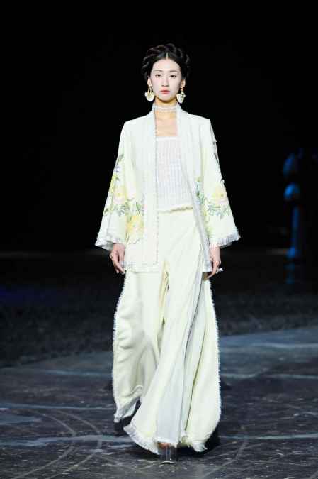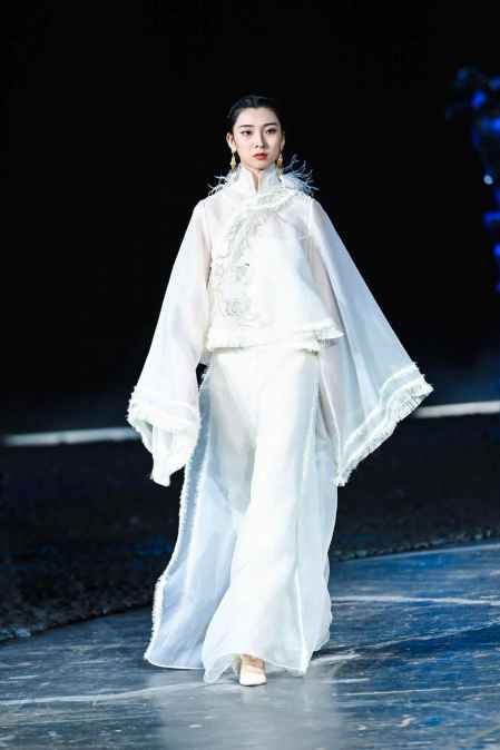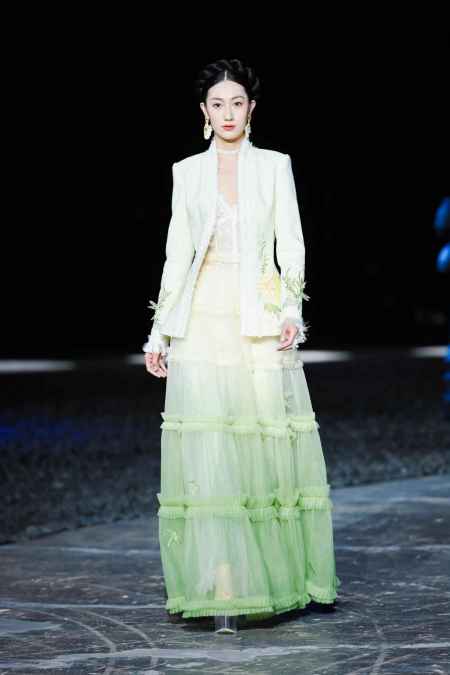 【烟柳·蝶影】系列灵感来源于蝶舞,飘逸的蝉翼纱和挺括时装料结合应用,简约的西装衬衣组合,中式立领元素和西式版型的融合,勾勒出曼妙柔美的形体。传统手工流苏缀于裙摆和袖口,随风舞动、摇曳多姿,恰似蝶舞纷飞,展现一番优美景象。