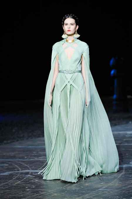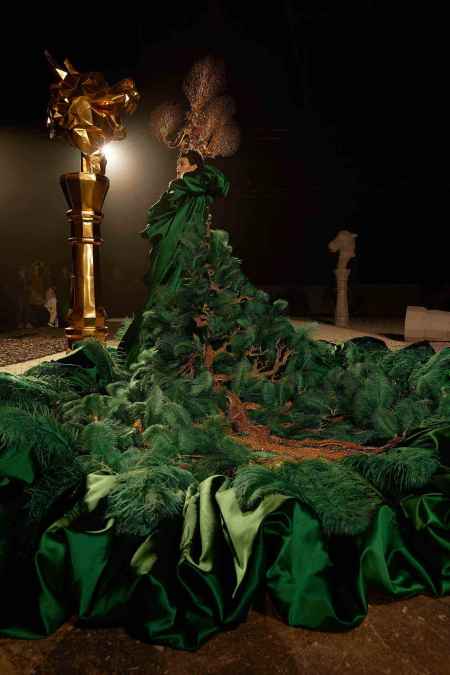 【雅翠叠香】系列主要以不同层次的绿色为主色调,以褶皱和流线型裁剪为设计点。在底摆与背后应用工字褶,扇形褶等工艺结合人体结构与空间设计,流动飞舞的垂坠面料,彷如棕榈叶片随风摇曳。在中国绿色象征大地万物和谐,表现出一种强大的治愈力和生命力。在西方,阿佛洛狄特女神被描绘为身着绿色服饰的形象,象征纯洁、繁衍与和平。