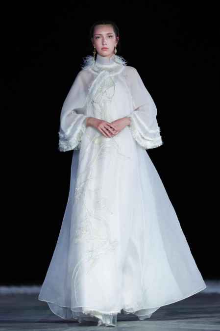【雪域之光】系列灵感来源于雪域高原,正如仓央嘉措所说:“那佛光闪闪的高原,三步两步便是天堂”。白、金色为主调,若隐若现的薄透烟罗纱面料,如阳光下雪域高原的天空,清澈柔软、透净。将中式立领和复古阔袖元素运用其中,将雪尼尔绒线等数十种材料通过传统绒线绣和苏绣进行表现,柔软晶莹。