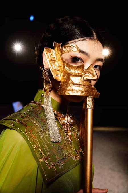 【黄金面具】天之四灵系列中,象征着生命的复苏和萌芽,代表着春天的服饰款式,佩戴的黄金面具,灵感来源于三星堆出土的神秘黄金面具,更凸显了设计每个系列作品中,对历史的尊重与文化的传承。