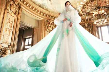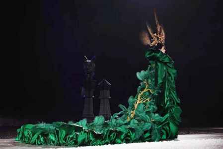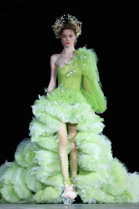 【青灵·蝶仙】系列充满生机的绿意,从渐渐消融的白雪间,这是大地复苏的旋律,这是万花盛开的催化剂。行走中,如春风拂过干枯的大地,层层叠叠如草地亦如麦浪,春之女神步步带来生机,非遗绒花盛开在春天的气息里,水晶、米珠亮片等数十种材料刻画之上,一只白色的蝴蝶轻落唇齿间,撩拨着**的情缘,烙下了一世的缠绵…蝴蝶它美在自然与和谐,作为大自然的精灵,蝴蝶破茧之前沉沉而睡,生命被黑暗覆盖,沉埋于寂静之中。让生命破茧成蝶,带来振动透明的薄翼,以舞者的姿态翩飞,如诗如画,充满着生命的气息绽放美丽的一生。