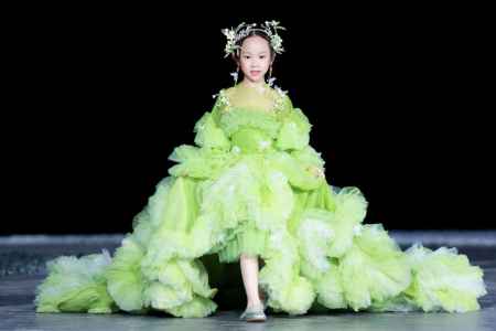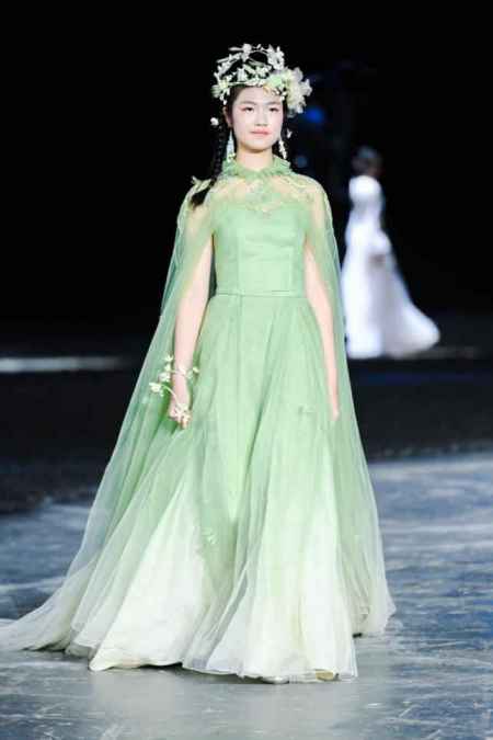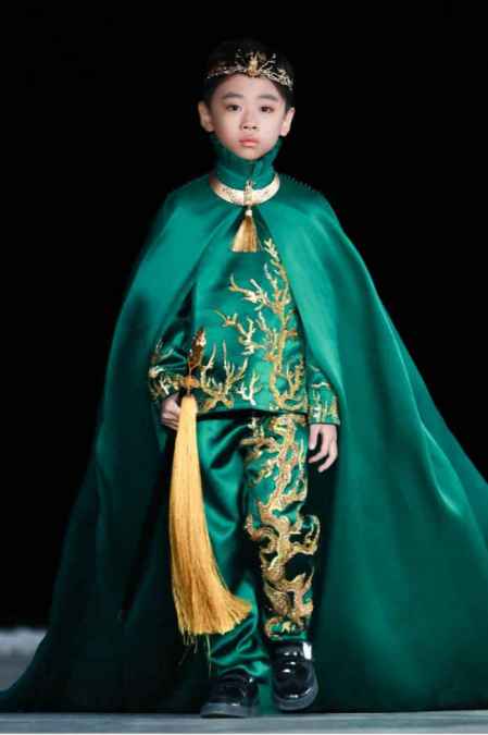 征途在前,少年驰骋。本场发布会上,小超模们身着品牌高定秀款服装仙萌灵动,气韵风雅比肩专业超模。其中超模程楚宜身着“陌上·花魂”主题华服,宛如花中仙子,蜻蜓坠于裙摆,灵动华美,生机勃勃。童模齐浚廷身着压轴同款“扶桑神树”主题童服饰,通身绿装浮衬金色树纹图腾,充满了生命力和希望感。童模王俽冉身着“青灵·蝶仙”主题服饰,层叠如画,生机盎然,仿若秘境精灵。