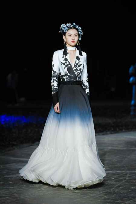 本次秀场上共发布展示12个主题的系列服饰,近80套高定秀款服装。其中【夜色·花影】系列主要以黑白灰为色彩基调表达东方艺术的禅意,以花卉剪影为主体的拼接设计,形成多重空间的画幅,采用进口亚光斜纹时装料结合缎面质感的印花面料,塑造不同质感,向人们展示纯粹的女性精神。