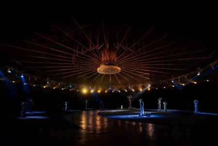 本次秀场置景也是根据想要表达的主题,进行了巧思的设置。秀演太极的舞台和八组座位设置构成了乾坤阴阳八卦图,太极阴阳的空间中,矗立12兽首;而场地穹顶设计为日晷,将时间和空间相对应。我们将中国文化意境化在一场服装秀中,形成故事性的动线。包括在本次发布会的服装中,或显或隐的展现12兽首元素,如用鼠尾花图案来象征老鼠。