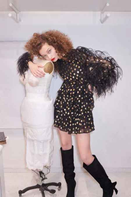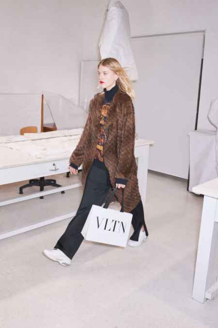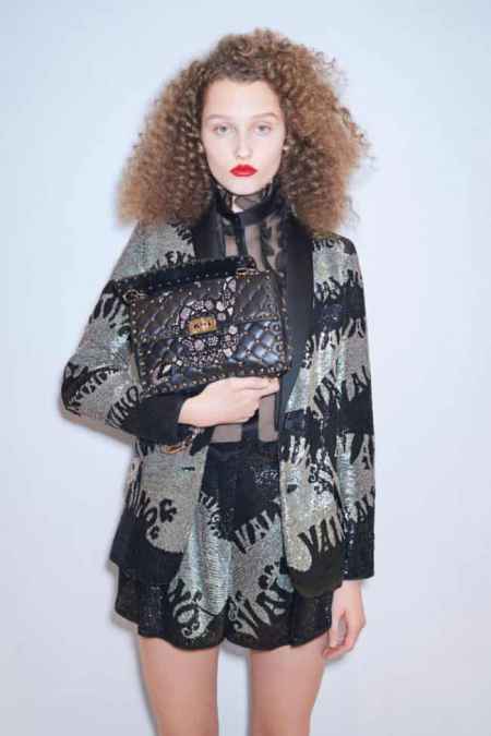Pierpaolo Piccioli 自创的「VLTN」 字母出现在各式配件上,包括采用皮革制成的「paper shopping bag」 ,甚至在与Moncler 合作推出的窄身puffer coat 背面的水貂皮上,还加入了精致绝伦的黑色嵌花。运动、街头格调的加入使得Valentino 的浪漫气氛被淡化,取而代之的是一种Pierpaolo Piccioli 也鼎力支持的享乐态度。另外,早秋系列也不缺乏派对礼服,其中绝大部分都是闪耀风格,从水晶玫瑰到金色波尔卡圆点,都印证著Valentino 绝无仅有的做工。