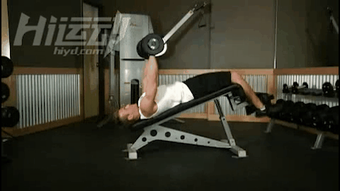 1、将腿部固定在下斜面长椅的顶端然后躺下,双手各持一个哑铃,放在腿上。掌心彼此相对。