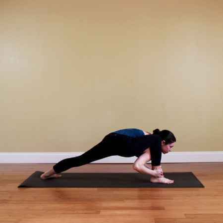 ● 从下犬式开始,吸气,然后迈出右腿至双手之间,就像要做战士一式一样。弯**体,右手臂穿过弯曲的膝盖,双手保住右脚踝。保持重心,坚持住这个姿势。如果这对**内侧实在负担过重,你可以将一只或者双手支撑于地板上。